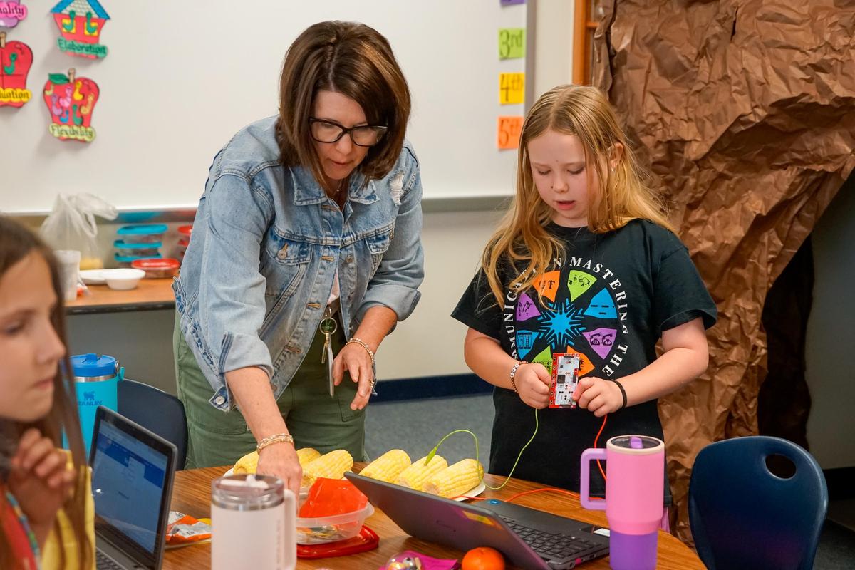 With that foundational understanding of conductivity, students were then able to create, test, and troubleshoot their own musical inventions. Using the Makey Makey kits, they’ve made music from carrots, gummy worms, bell peppers, clay, corncobs, apples, foil, gelatin, and other everyday items.